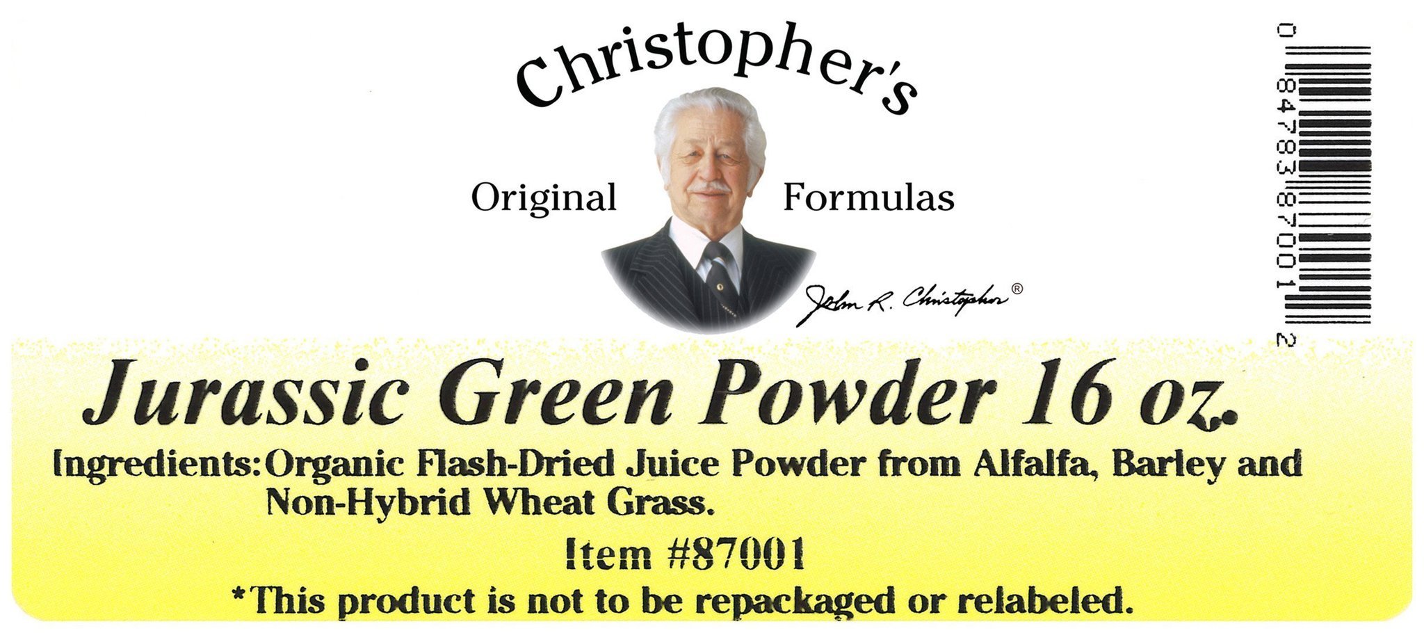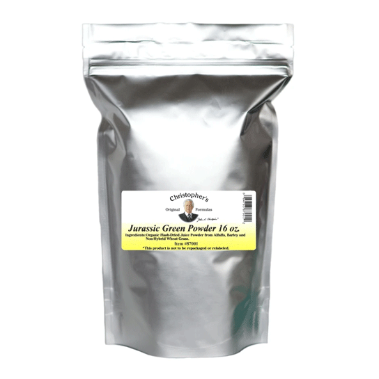 Dr. Christopher's Jurassic Green is packed full of phyto-nutrients, whole food vitamins, trace minerals, active enzymes, chlorophyll, balanced amino acids & other important nutrients needed by the body.