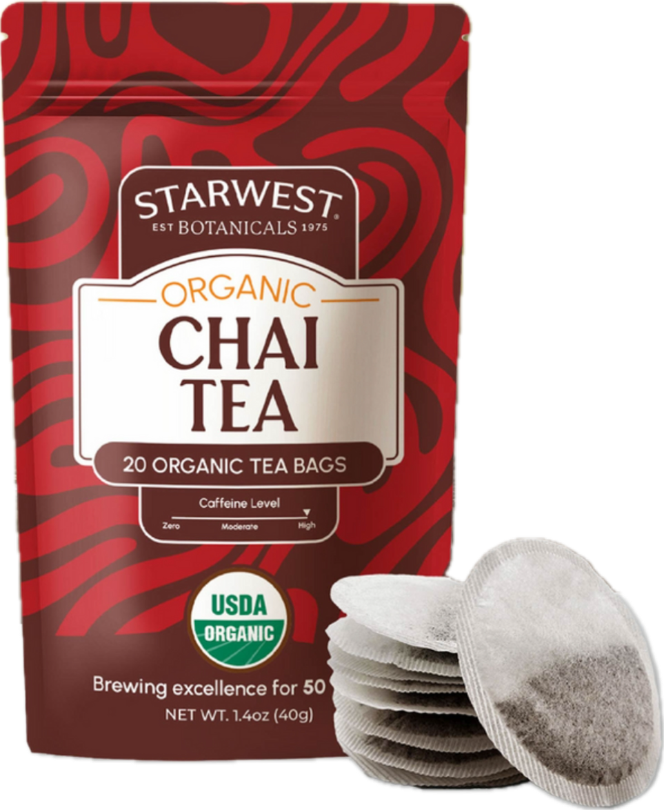Spice up your day with our rich and bold Organic Chai Tea Bags. An exotic blend of black tea and fragrant spices, Starwest's Organic Chai Tea delivers a warm and invigorating experience with every sip.
