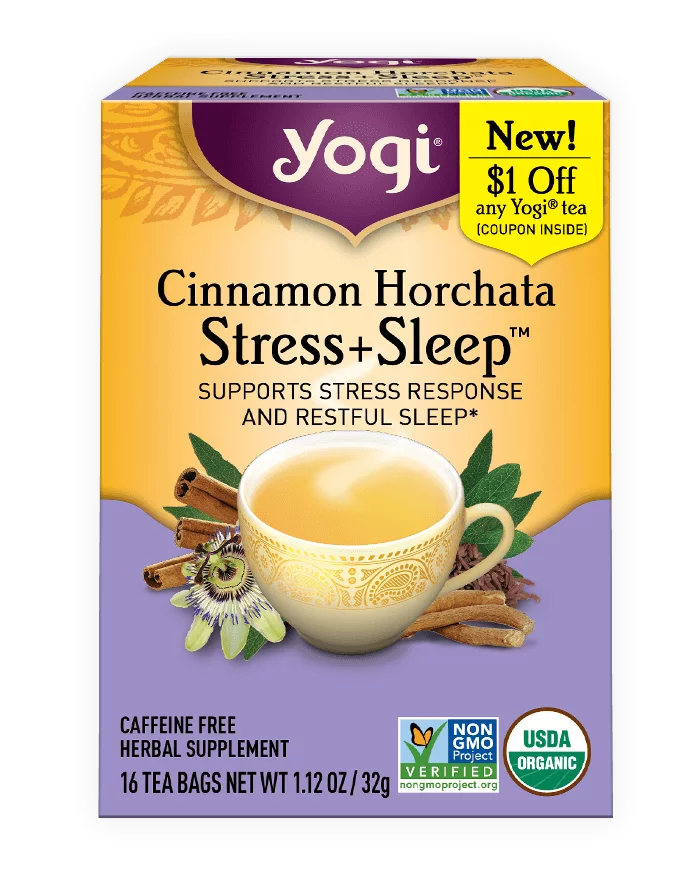 Yogi Tea Cinnamon Horchata Stress + Sleep uses adaptogenic Ashwagandha and Passionflower to promote relaxation and better rest. Combined with warming Cinnamon and toasty Rice, this herbal blend produces a comforting cup that helps promote stress relief and healthy sleep.