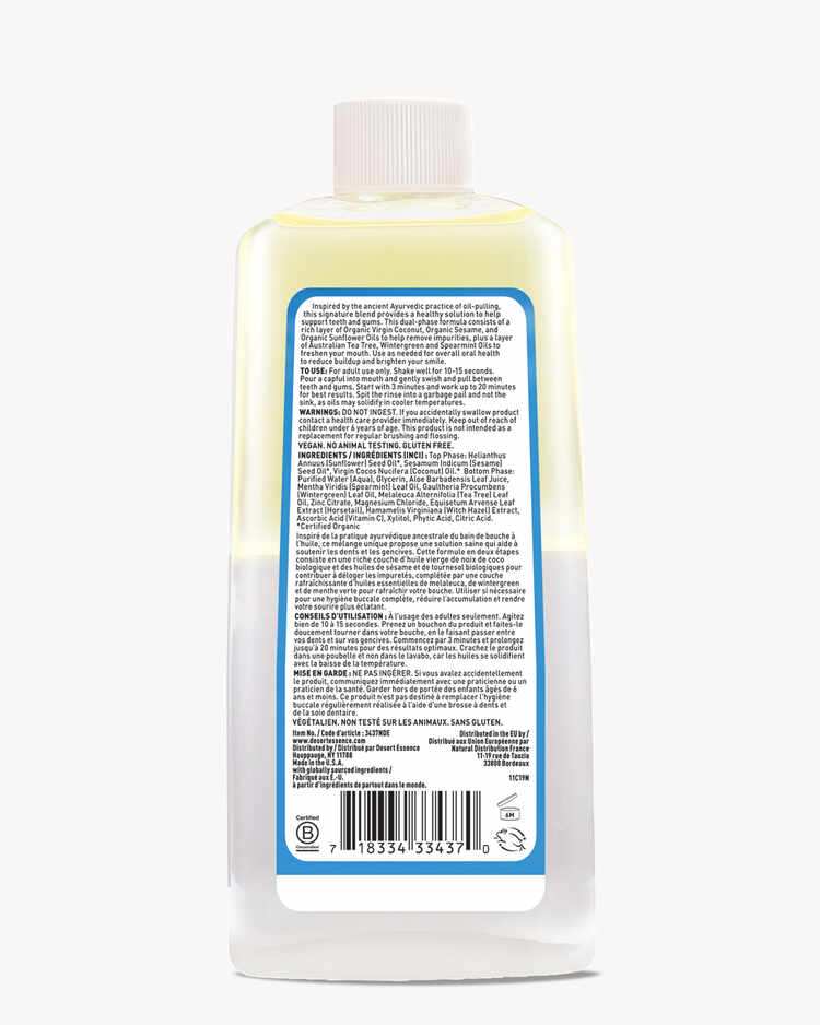Inspired by the ancient Ayurvedic practice of oil pulling, this dual phase pulling rinse formulated with Organic Virgin Coconut Oil, Organic Sesame and Organic Sunflower Oil helps remove impurities from teeth and gums, while freshening breath with pure Australian Tea Tree, Wintergreen and Spearmint Oils.