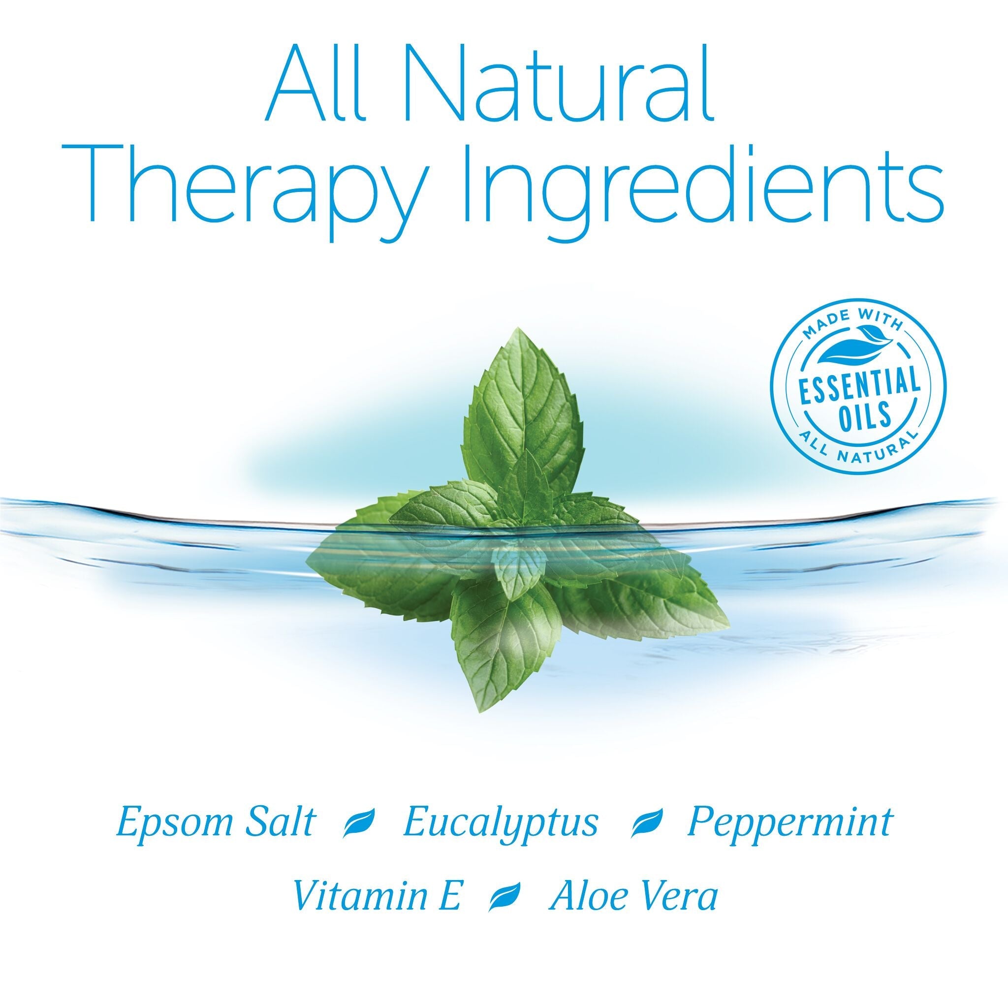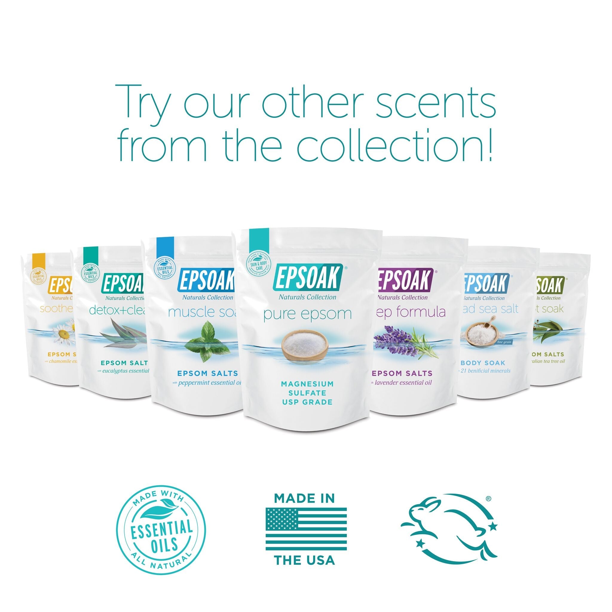EPSOAK® Naturals Collection Muscle Soak is made with premium Epsom Salt (Magnesium Sulfate) infused with Eucalyptus and Peppermint essential oils.