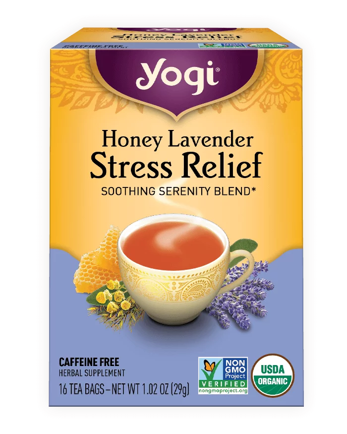 Relax and breathe in the enchanting aroma of Yogi Honey Lavender Stress Relief tea. Made with herbs traditionally used for relaxation including Lavender, Chamomile, and Lemon Balm; Yogi Honey Lavender Stress Relief tea is a soothing blend that helps your body and mind to unwind.*