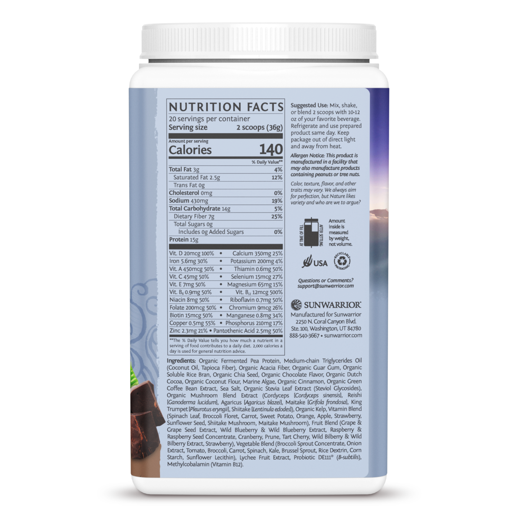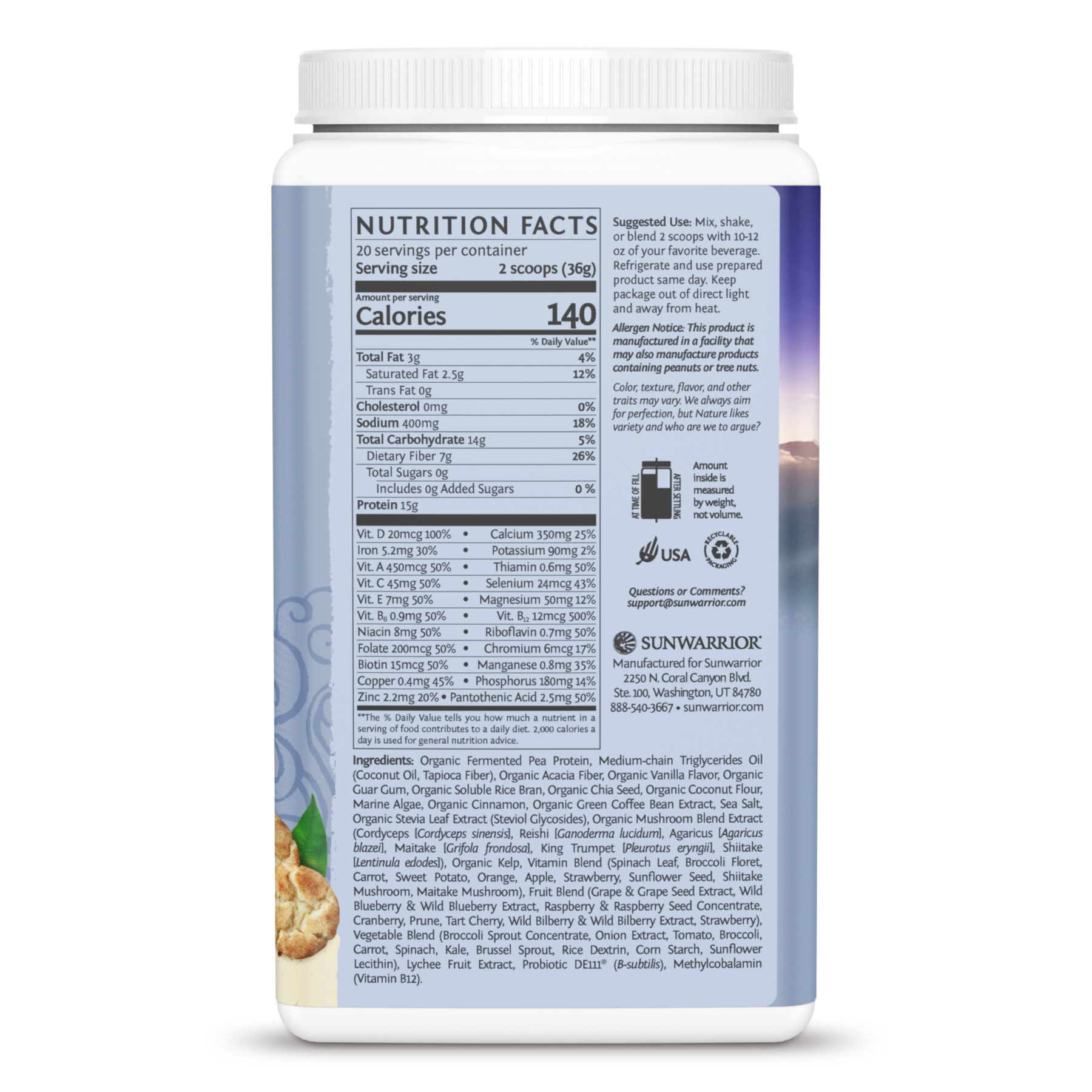 Chocolate: Organic Pea Protein, Organic Medium-chain Triglycerides Oil Powder, Organic Acacia Gum, Organic Chia Seeds, Organic Guar Gum, Organic Natural Flavor, Organic Dutch Cocoa Powder, Organic Coconut Flour, Organic Marine Red Algae, Sea Salt, Organic Cinnamon Powder, Organic Stevia Leaf Extract (Steviol Glycosides), PeakO2® Organic Mushroom Blend (Cordyceps [Cordyceps militaris], Reishi [Ganoderma lucidum], King Trumpet [Pieurotus eryngii], Shiitake [Lentinula edodes], Lion's Mane [Hericium erinaceus], Turkey Tail [Trametes versicolor]), Organic Kelp Powder, Vitamin Blend (Spinach, Broccoli, Carrot, Sweet Potato, Orange, Apple, Strawberry, Sunflower Seed, Shiitake Mushroom, Maitake Mushroom), Fruit Blend (Grape & Grape Seed Extract, Wild Blueberry & Wild Blueberry Extract, Raspberry & Raspberry Seed Concentrate, Cranberry, Prune, Tart Cherry, Wild Bilberry & Wild Bilberry Extract, Strawberry), Vegetable Blend (Broccoli Sprout, Onion Extract, Broccoli, Tomato, Carrot, Spinach, Kale, Brussel Sprout), Bacillus subtilis (DE111® Probiotic), Methylcobalamin (Vitamin B12). Salted Caramel: Organic Pea Protein, Organic Medium-chain Triglycerides Oil Powder, Organic Acacia Gum, Organic Natural Flavor, Organic Chia Seeds, Organic Guar Gum, Organic Coconut Flour, Sea Salt, Organic Marine Red Algae, Organic Stevia Leaf Extract (Steviol Glycosides), Organic Cinnamon Powder, PeakO2® Organic Mushroom Blend (Cordyceps [Cordyceps militaris], Reishi [Ganoderma lucidum], King Trumpet [Pieurotus eryngii], Shiitake [Lentinula edodes], Lion's Mane [Hericium erinaceus], Turkey Tail [Trametes versicolor]), Organic Kelp Powder, Vitamin Blend (Spinach, Broccoli, Carrot, Sweet Potato, Orange, Apple, Strawberry, Sunflower Seed, Shiitake Mushroom, Maitake Mushroom), Fruit Blend (Grape & Grape Seed Extract, Wild Blueberry & Wild Blueberry Extract, Raspberry & Raspberry Seed Concentrate, Cranberry, Prune, Tart Cherry, Wild Bilberry & Wild Bilberry Extract, Strawberry), Vegetable Blend (Broccoli Sprout, Onion Extract, Broccoli, Tomato, Carrot, Spinach, Kale, Brussel Sprout), Bacillus subtilis (DE111® Probiotic), Methylcobalamin (Vitamin B12). Snickerdoodle: Organic Pea Protein, Organic Medium-chain Triglycerides Oil Powder, Organic Acacia Gum, Organic Natural Flavor, Organic Chia Seeds, Organic Guar Gum, Organic Coconut Flour, Organic Marine Red Algae, Sea Salt, Organic Cinnamon Powder, Organic Stevia Leaf Extract (Steviol Glycosides), PeakO2® Organic Mushroom Blend (Cordyceps [Cordyceps militaris], Reishi [Ganoderma lucidum], King Trumpet [Pieurotus eryngii], Shiitake [Lentinula edodes], Lion's Mane [Hericium erinaceus], Turkey Tail [Trametes versicolor]), Organic Kelp Powder, Vitamin Blend (Spinach, Broccoli, Carrot, Sweet Potato, Orange, Apple, Strawberry, Sunflower Seed, Shiitake Mushroom, Maitake Mushroom), Fruit Blend (Grape & Grape Seed Extract, Wild Blueberry & Wild Blueberry Extract, Raspberry & Raspberry Seed Concentrate, Cranberry, Prune, Tart Cherry, Wild Bilberry & Wild Bilberry Extract, Strawberry), Vegetable Blend (Broccoli Sprout, Onion Extract, Broccoli, Tomato, Carrot, Spinach, Kale, Brussel Sprout), Bacillus subtilis (DE111® Probiotic), Methylcobalamin (Vitamin B12). Vanilla: Organic Pea Protein, Organic Vanilla Flavor, Organic Medium-chain Triglycerides Oil Powder, Organic Acacia Gum, Organic Chia Seeds, Organic Guar Gum, Organic Coconut Flour, Organic Marine Red Algae, Sea Salt, Organic Stevia Leaf Extract (Steviol Glycosides), PeakO2® Organic Mushroom Blend (Cordyceps [Cordyceps militaris], Reishi [Ganoderma lucidum], King Trumpet [Pieurotus eryngii], Shiitake [Lentinula edodes], Lion's Mane [Hericium erinaceus], Turkey Tail [Trametes versicolor]), Organic Kelp Powder, Vitamin Blend (Spinach, Broccoli, Carrot, Sweet Potato, Orange, Apple, Strawberry, Sunflower Seed, Shiitake Mushroom, Maitake Mushroom), Fruit Blend (Grape & Grape Seed Extract, Wild Blueberry & Wild Blueberry Extract, Raspberry & Raspberry Seed Concentrate, Cranberry, Prune, Tart Cherry, Wild Bilberry & Wild Bilberry Extract, Strawberry), Vegetable Blend (Broccoli Sprout, Onion Extract, Broccoli, Tomato, Carrot, Spinach, Kale, Brussel Sprout), Bacillus subtilis (DE111® Probiotic), Methylcobalamin (Vitamin B12).
