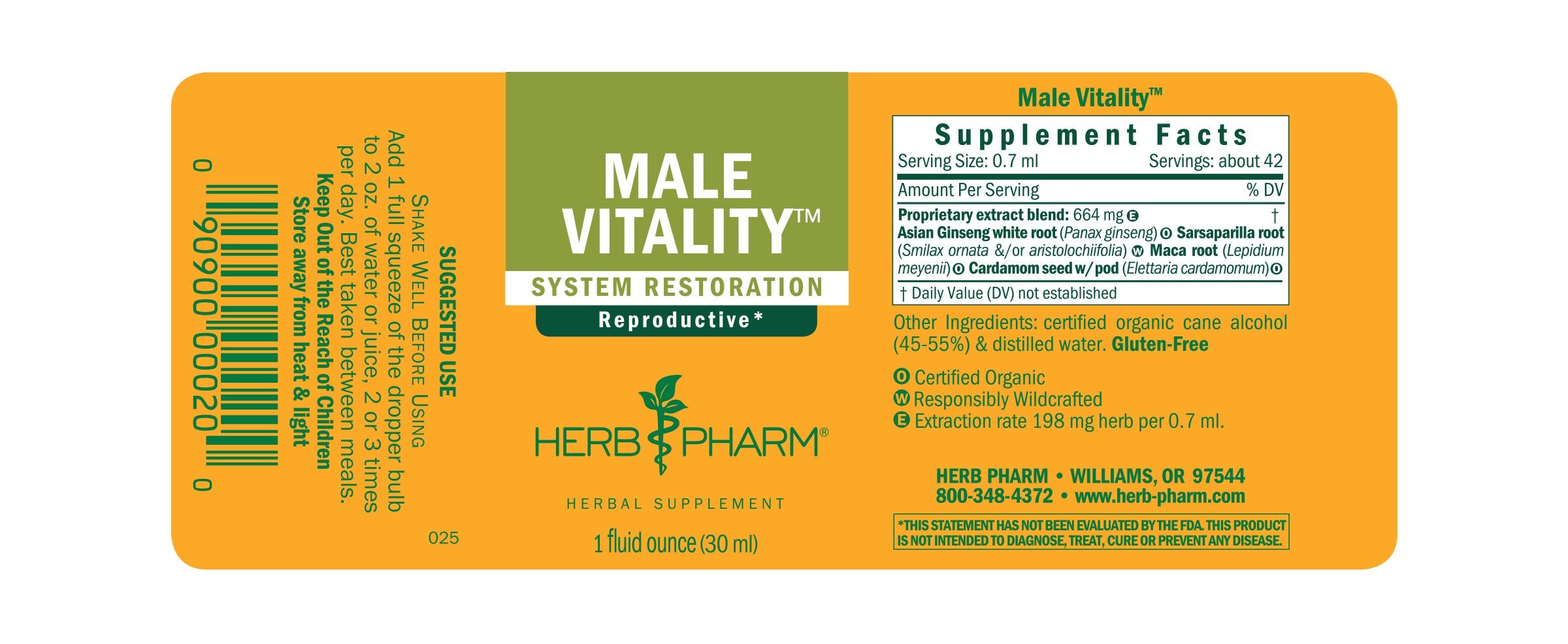 Male Vitality features Asian Ginseng extract prepared from the roots of Certified Organic Panax ginseng plants. It also features Maca prepared from the dried root of Certified Organic Lepidium meyenii plants. Our Maca is grown for us at an altitude of 12,000 to 15,000 feet in the central highlands of Peru.