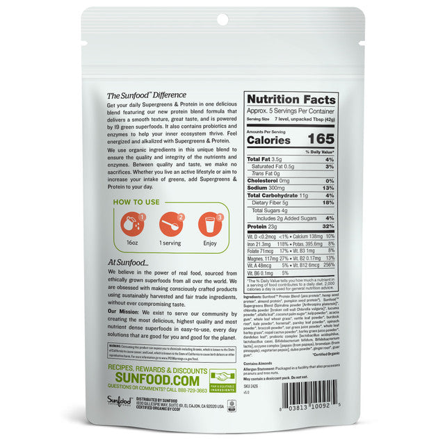 Sunfood Protein Blend (pea protein*, hemp seed  protein*, almond protein*, pumpkin protein*),  Sunfood Supergreens Blend (Spirulina powder [Arthrospira platensis]*, chlorella powder [broken cell wall chlorella vulgaris]*, whole leaf wheat grass*, nettle leaf powder*, burdock root*, alfalfa leaf*, kale powder*, horsetail*, parsley leaf powder*, spinach powder*, broccoli powder*, oat grass juice powder*, whole leaf barley grass*, nopal cactus powder*, barley grass juice powder*, dandelion leaf*, probiotic complex [lactobacillus acidophilus, lactobacillus casei, Bifidobacterium bifidum, Bifidobacterium lactis], enzyme complex [papain (from papaya), bromelain (from pineapple), vegetarian pepsin], kelp powder*, dulse powder*, ginger root*), lucuma powder*, coconut palm sugar*, acacia gum*, guar gum* (*certified organic).
