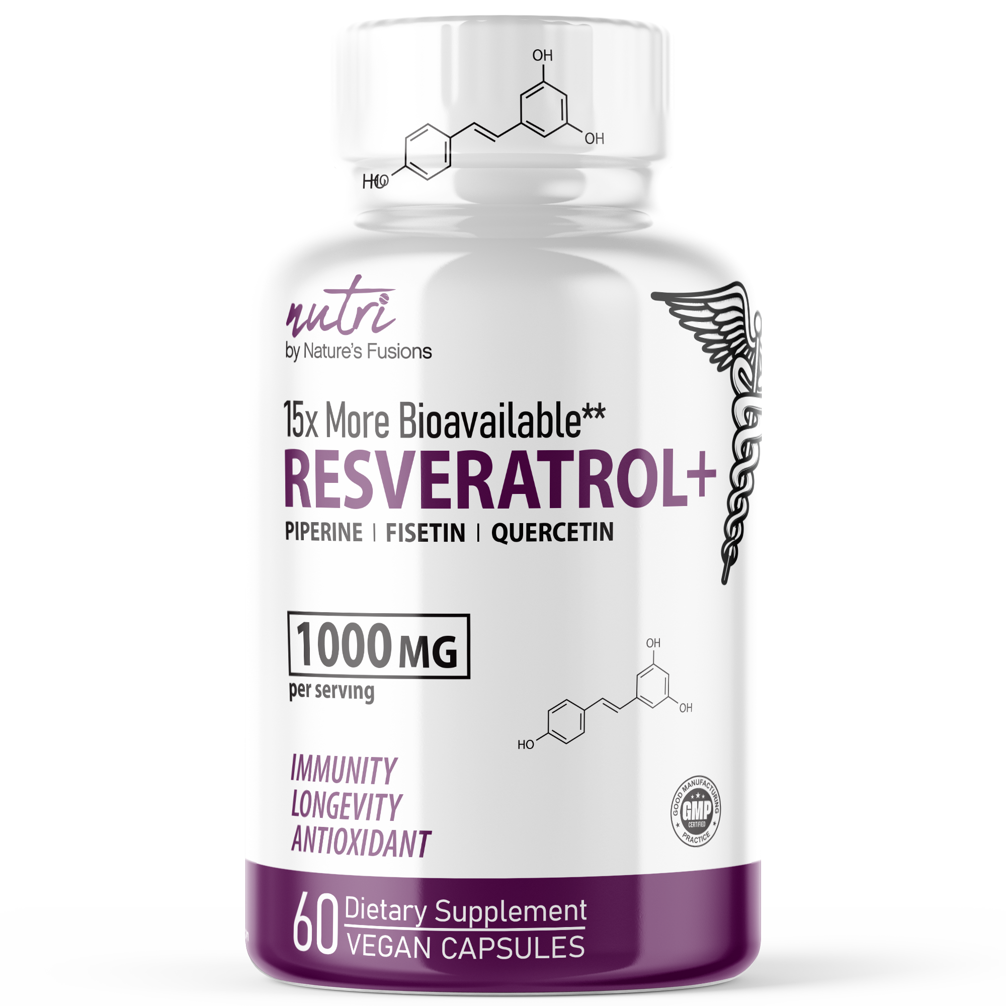 Each capsule contains 1000mg Trans-Resveratrol, 20mg Piperine, 30mg Quercetin, and 20mg Fisetin.